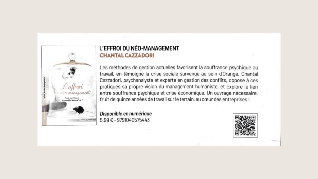 Autrice du livre : l’ EFFROI du Néo-Management, elle se trouve en lice parmi les 70 finalistes du Concours.